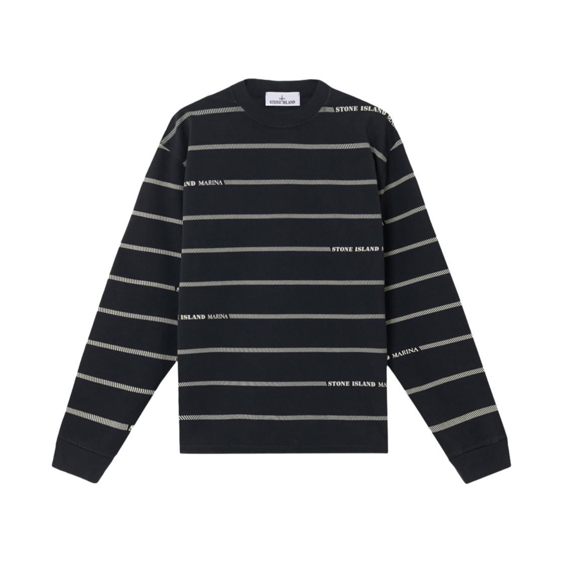 스톤 아일랜드 6100030 16/2 콤베드 오가닉 코튼 저지 스톤 아일랜드 마리나 오버사이즈 핏 크루넥 스웨트셔츠 스트라이프 앤 레터링 네이비 블루 - 25SS