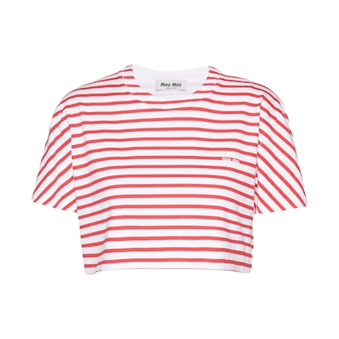 미우미우 여성 자수 로고 스트라이프 크롭 반팔 티셔츠 아이보리