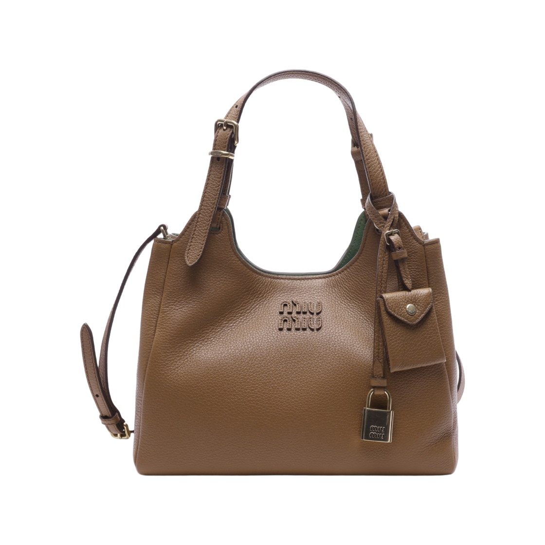 [20% 쿠폰] 미우미우 레더 토트숄더백 다크 브라운