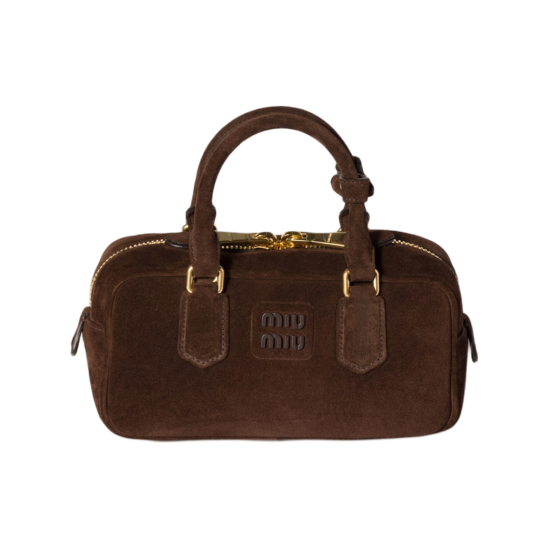 미우 미우 아르카디 패디드 스웨이드 탑 핸들 백 다크 브라운