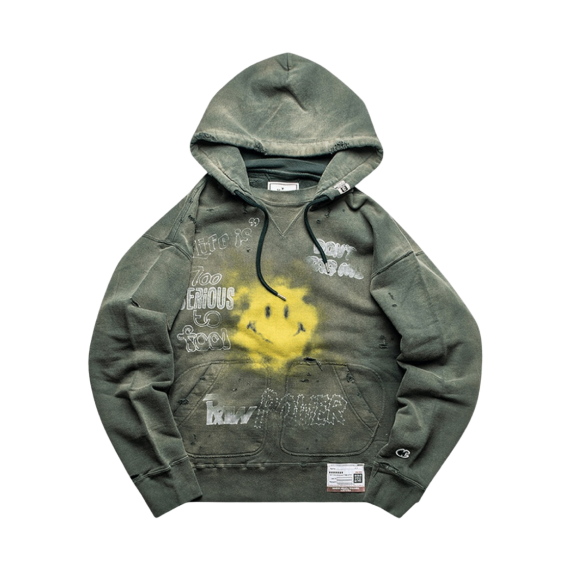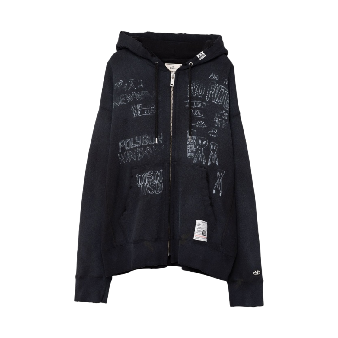 메종 미하라 야스히로 해피 페이스 프린트 디스트레스드 후드 블랙