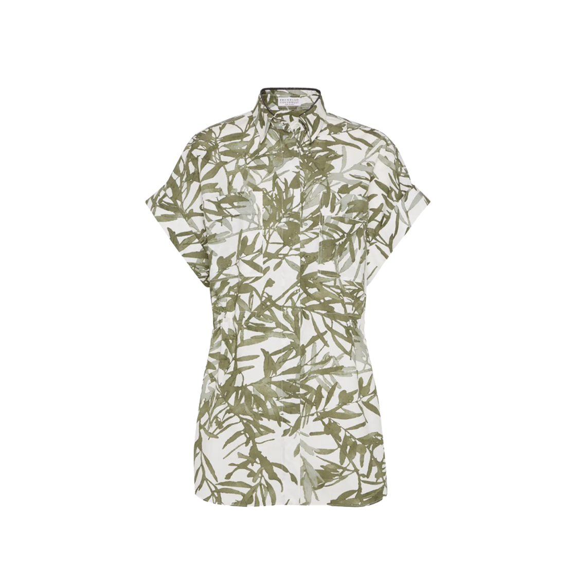 (W) 브루넬로 쿠치넬리 코튼 허바리움 프린트 포플린 샤이니 카라 디테일 숏슬리브 셔츠 민트 그린