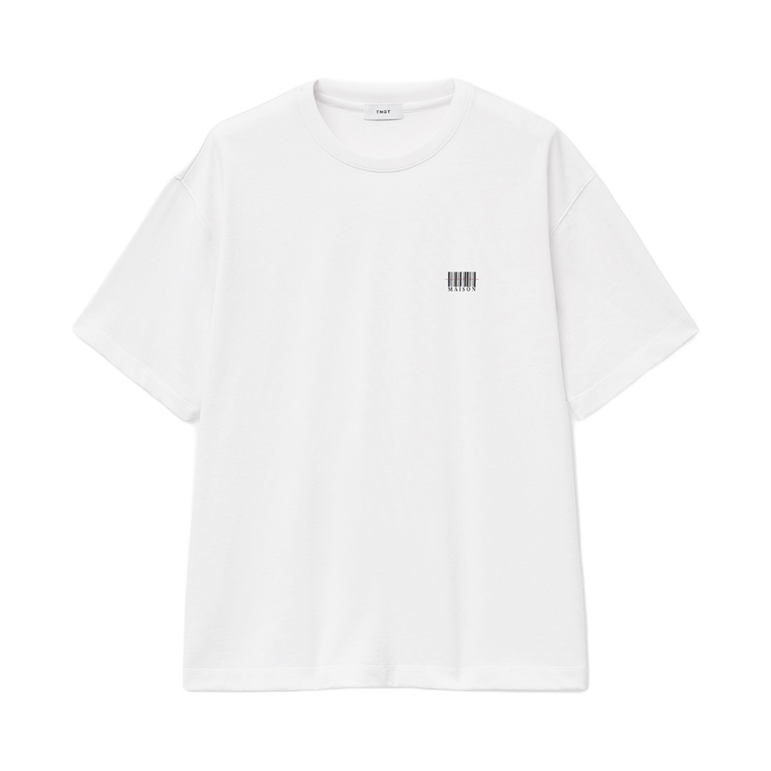 티엔지티 화이트 세미오버핏 바코드 스몰로고 티셔츠