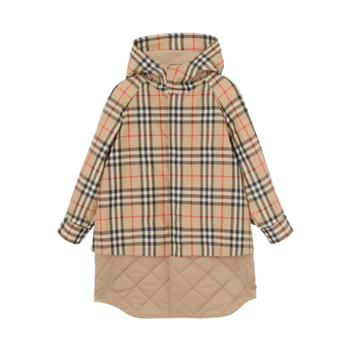 (키즈) 버버리 빈티지 체크 오버레이 코튼 트윌 후드 코트 아카이브 베이지