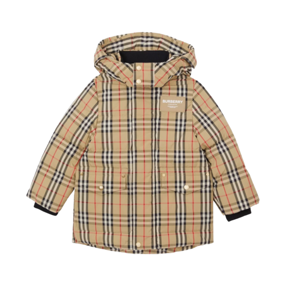 (키즈) 버버리 빈티지 체크 나일론 후드 퍼퍼 코트 아카이브 베이지