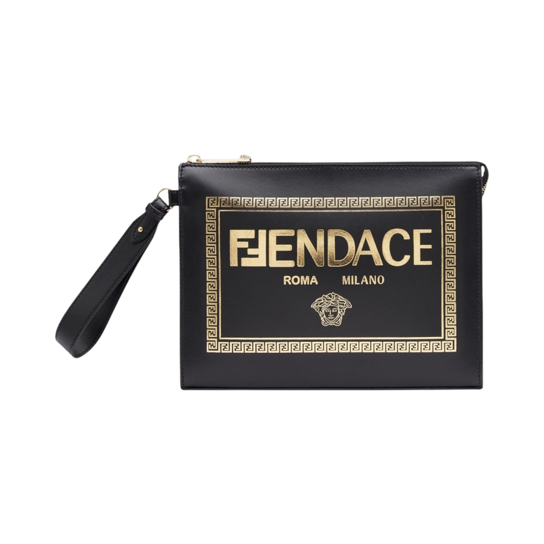 펜디 x 베르사체 펜다체 프린트 레더 펜다체 로고 플랫 파우치 블랙