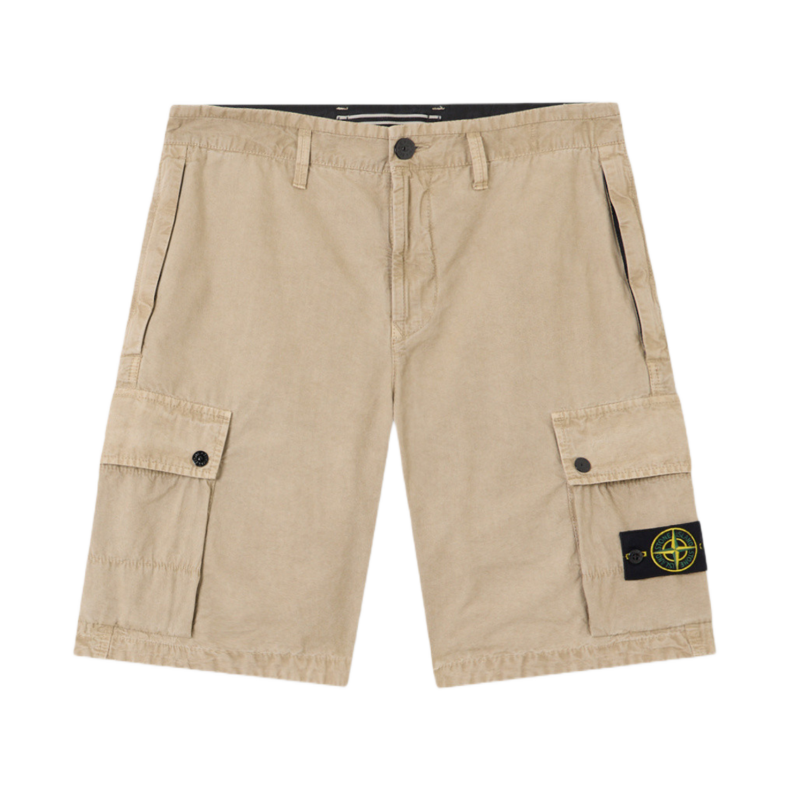 스톤 아일랜드 L100011 브러쉬드 오가닉 코튼 캔버스 올드 이펙트 슬림 핏 카고 버뮤다 쇼츠 집 포켓 데저트 - 25SS