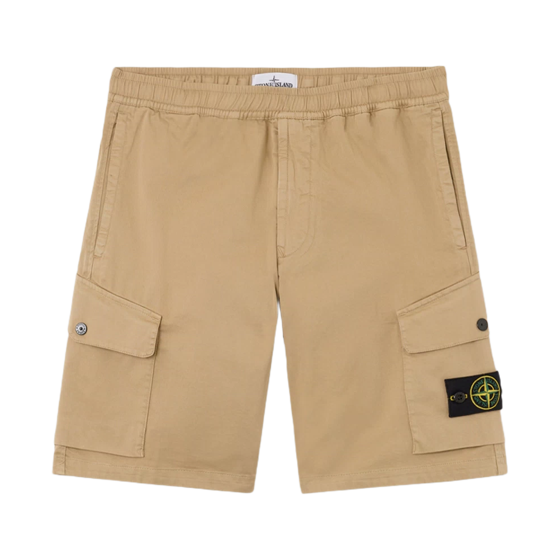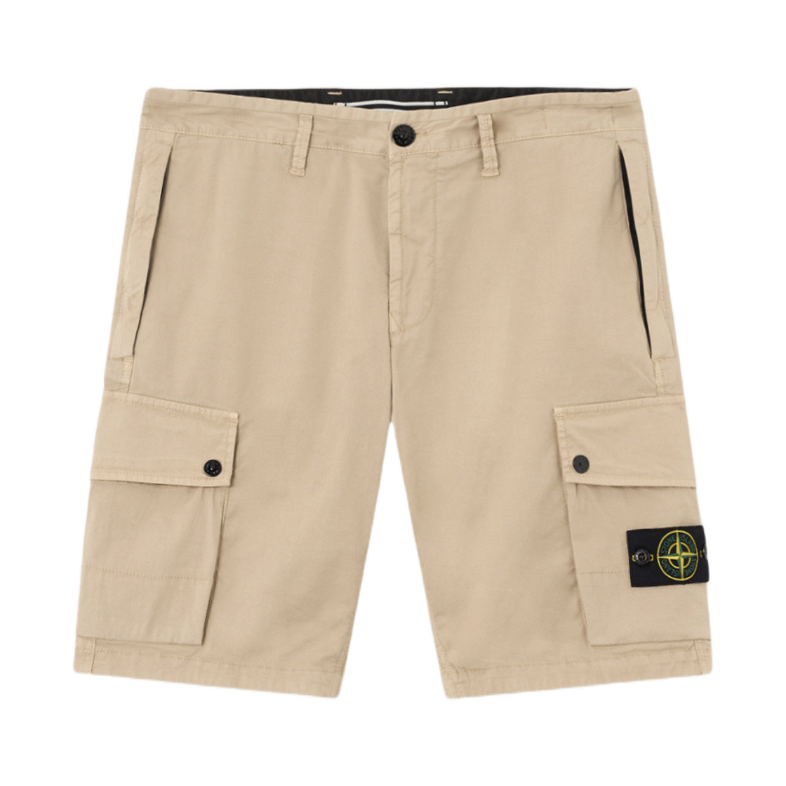 스톤 아일랜드 L100L03 오가닉 스트레치 코튼 사틴 레귤러 핏 카고 버뮤다 쇼츠 엘라스티케이티드 웨이스트밴드 비스킷 - 25SS