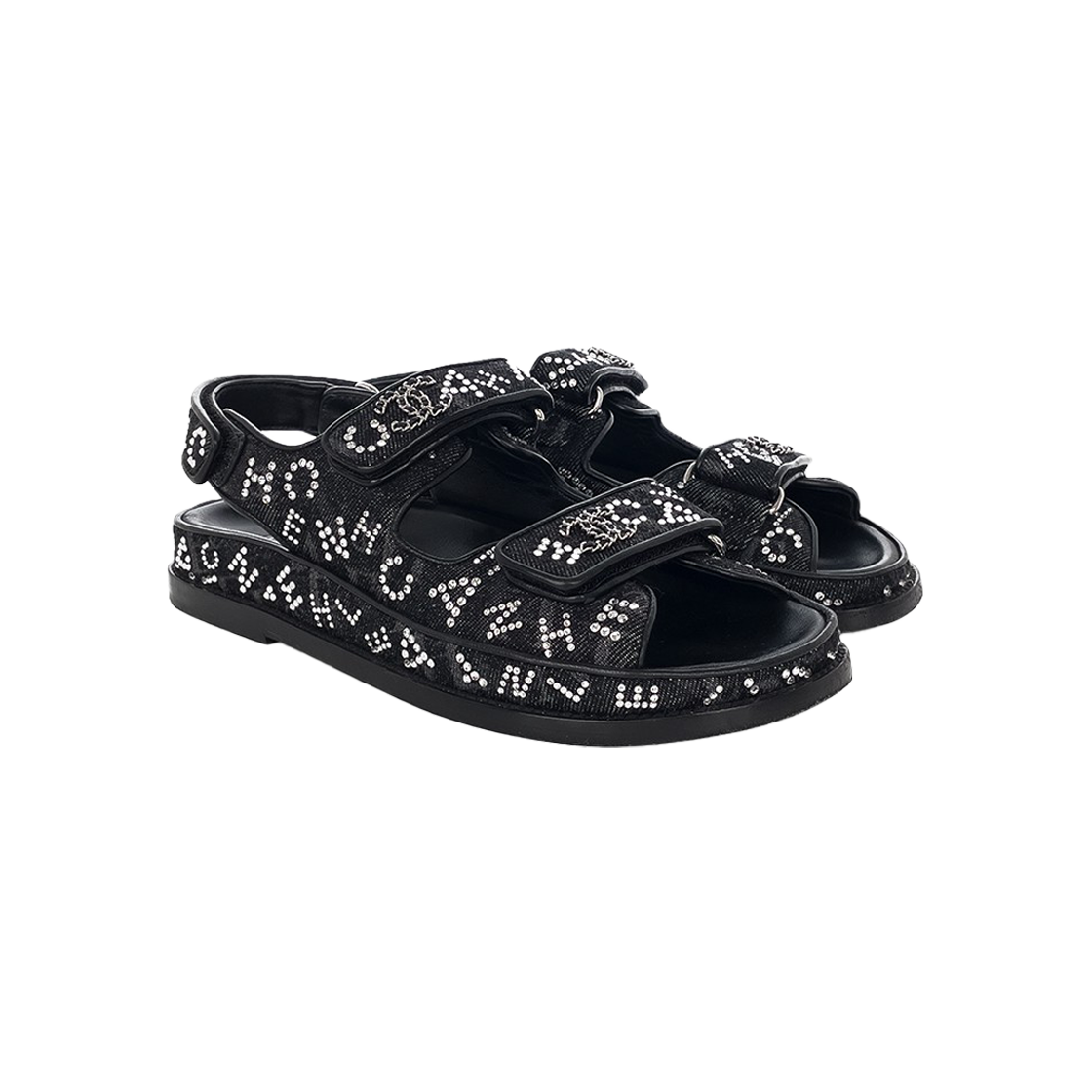 샤넬 24C 프린티드 데님&스트라스 벨크로 샌들 37 블랙