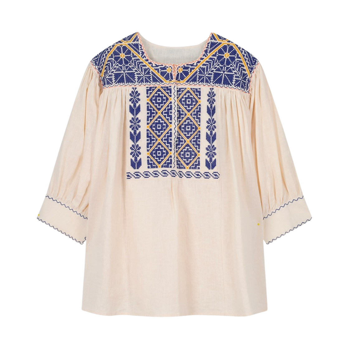 그린 버터 우먼 보헤미안 니들워크 린넨 블라우스 블루