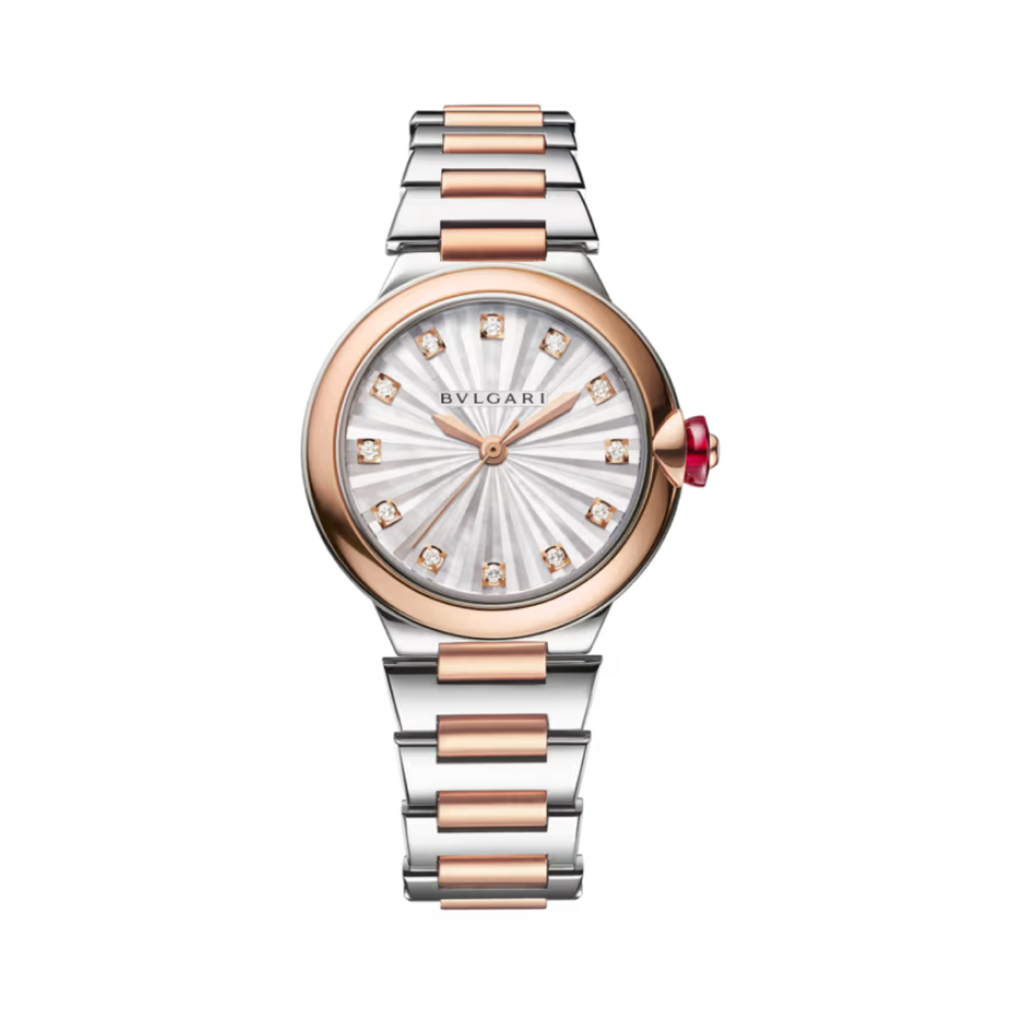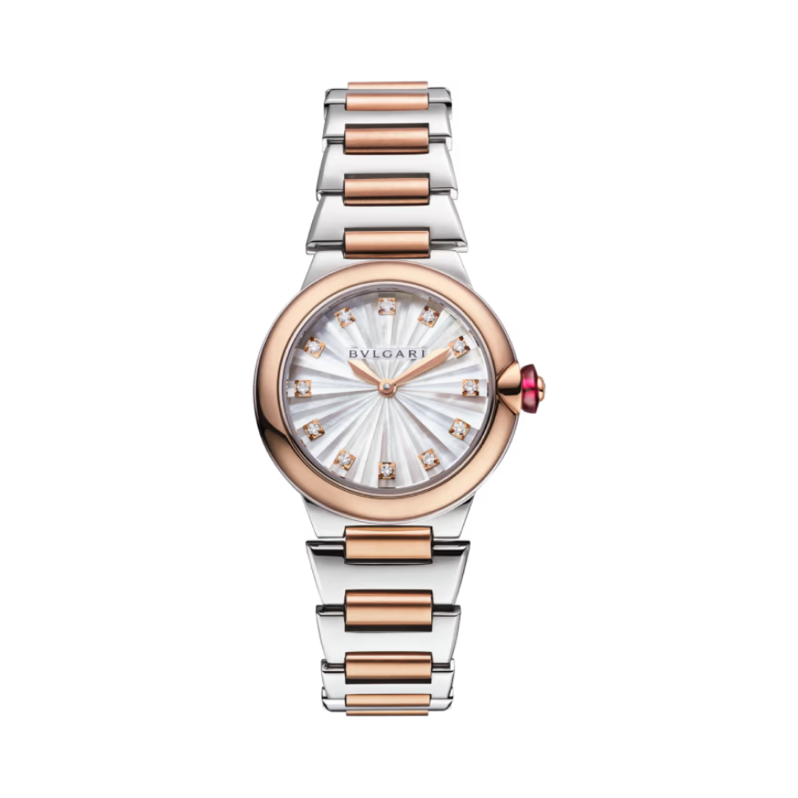 (W) 불가리 루체아 쿼츠 28mm 워치 스테인리스 스틸 로즈 골드 화이트 마더 오브 펄 다이아몬드