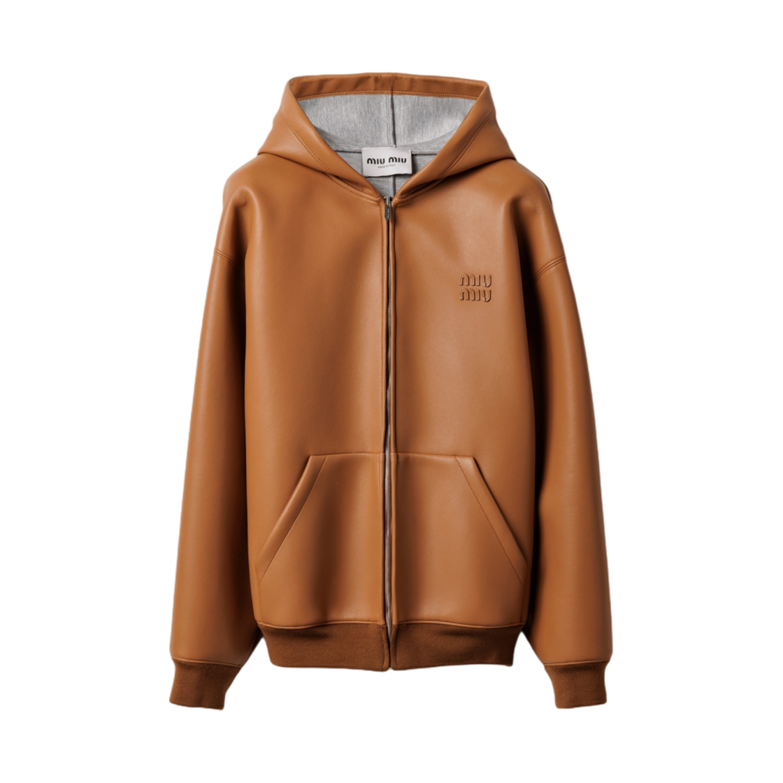 (W) 미우 미우 나파 레더 앤 본디드 저지 후드 자켓 브랜디
