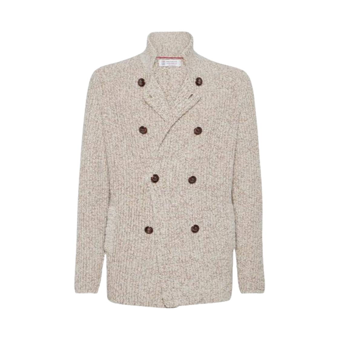 브루넬로 쿠치넬리 물리네 버진 울 실크 캐시미어 하프 잉글리시 립 원 어 하프 메탈 버튼 브레스티드 가디건 에크루