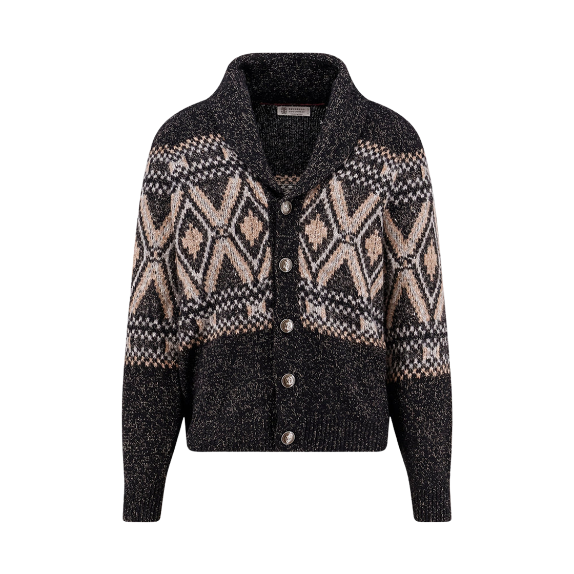 브루넬로 쿠치넬리 물리네 버진 울 실크 캐시미어 메탈 버튼 지오메트릭 자카드 가디건 블랙