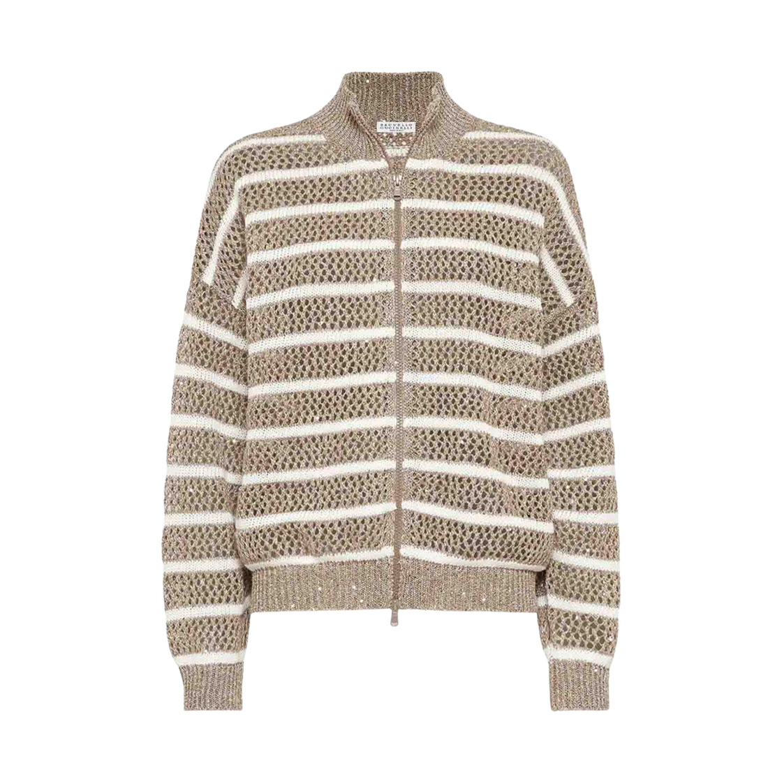 (W) 브루넬로 쿠치넬리 린넨 다즐링 스트라이프 네트 가디건 비스킷