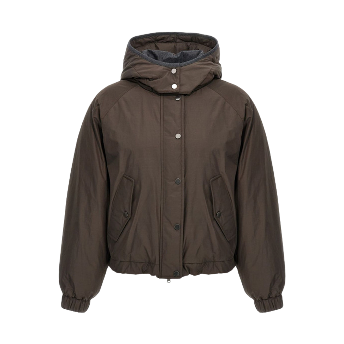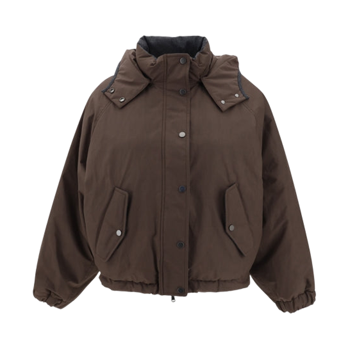 (W) 브루넬로 쿠치넬리 디테처블 후드 샤이니 지퍼 풀 테크노 코튼 발수 소재 태피터 크롭 다운 자켓 파인 콘 브라운
