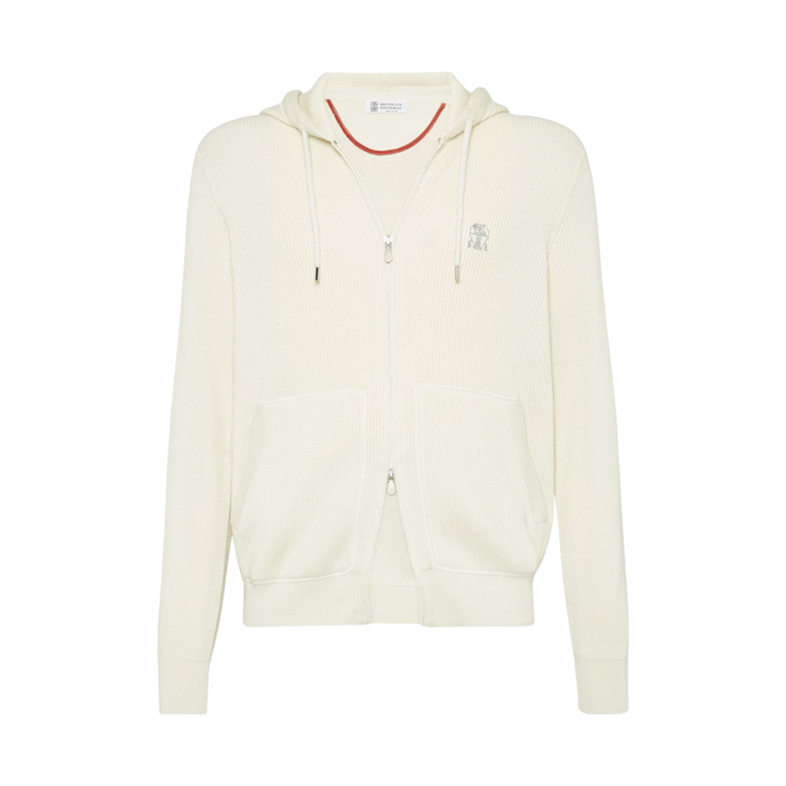브루넬로 쿠치넬리 로고 지퍼 코튼 잉글리시 립 니트 후드 스웨트셔츠 에크루