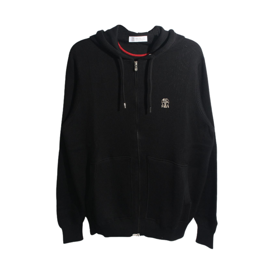 브루넬로 쿠치넬리 로고 지퍼 코튼 잉글리시 립 니트 후드 스웨트셔츠 블랙