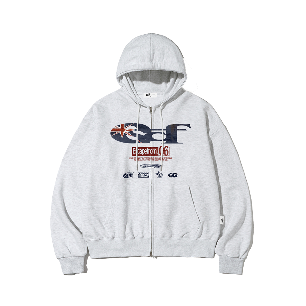 이스케이프프롬 빈티지 플래그 ESCF 로고 콜라주 프린트 투웨이 후드집업 화이트멜란지