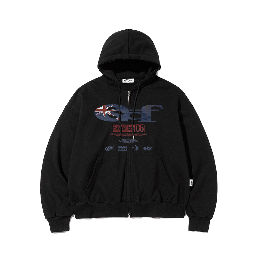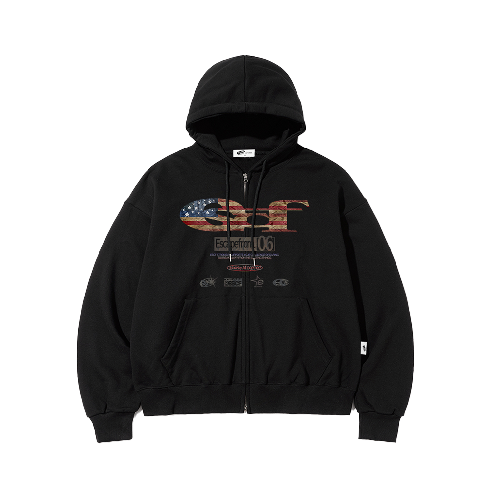 이스케이프프롬 빈티지 플래그 ESCF 로고 콜라주 프린트 투웨이 후드집업 블랙