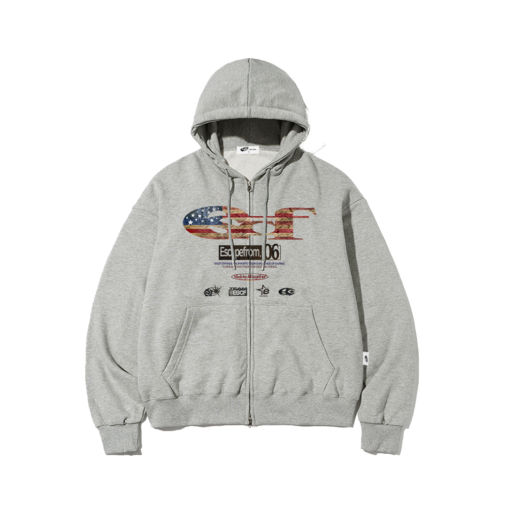 이스케이프프롬 빈티지 플래그 ESCF 로고 콜라주 프린트 투웨이 후드집업 그레이