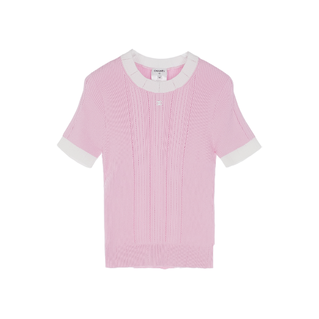샤넬 23P 라운드 코튼 숏슬리브 탑 40 라이트핑크 / 화이트