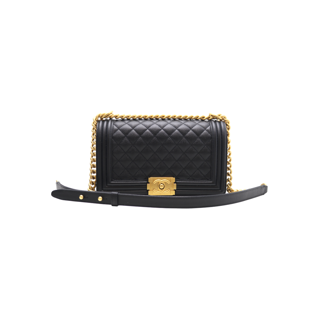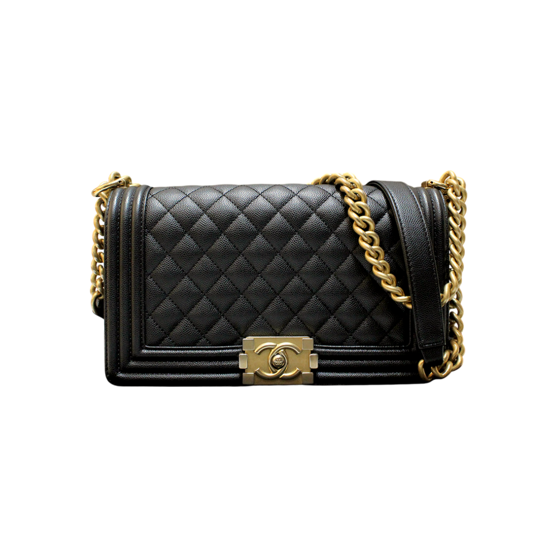 샤넬 보이 샤넬 미디움 플랩백 그레인드 카프스킨 & 골드 메탈 블랙
