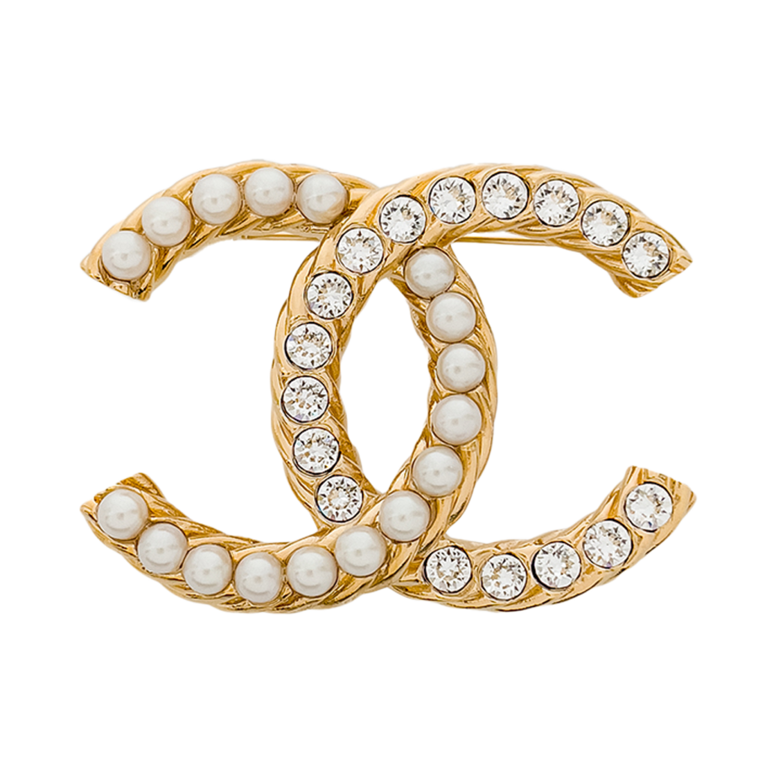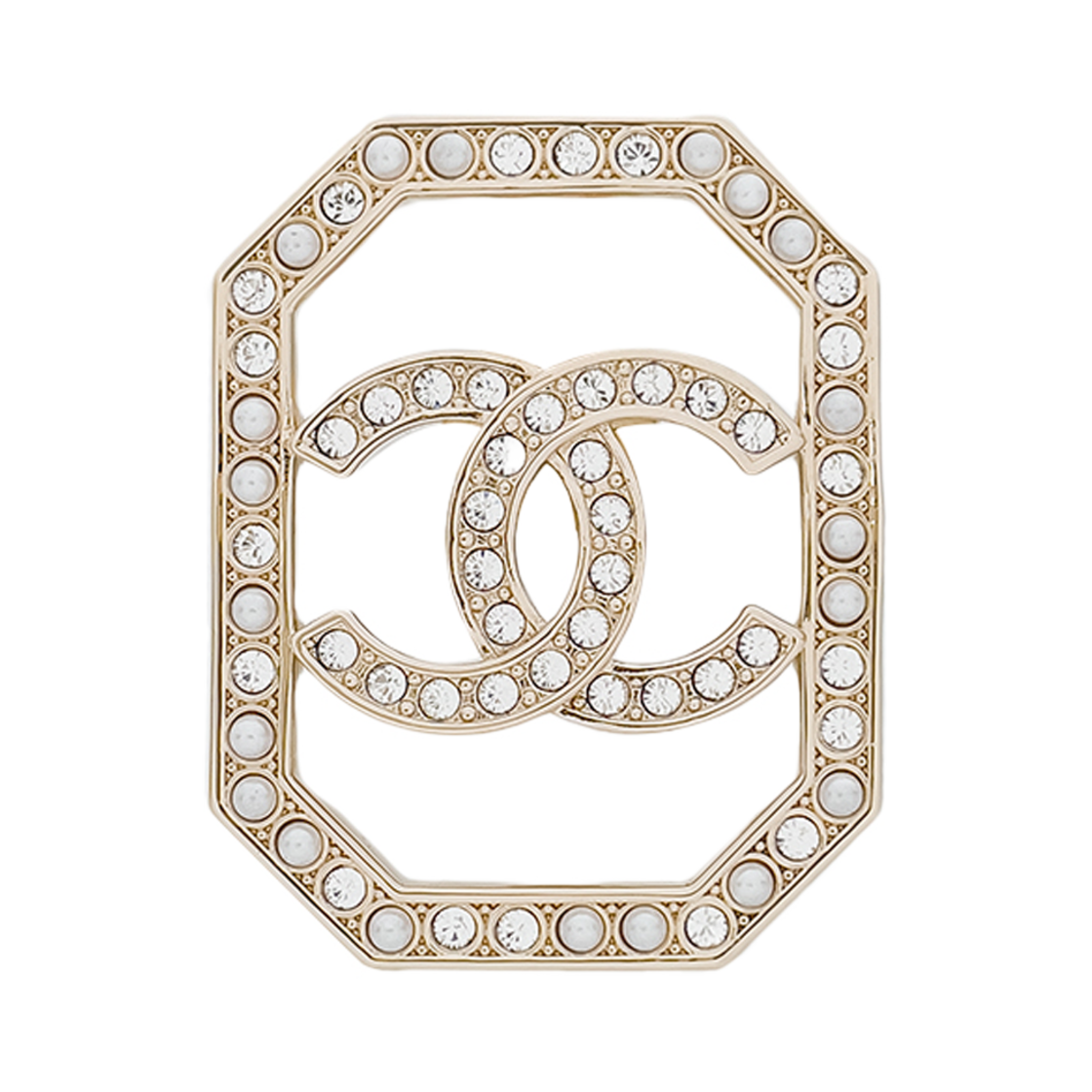 샤넬 브로치 메탈 라인스톤 & 골드 펄리 화이트 크리스탈