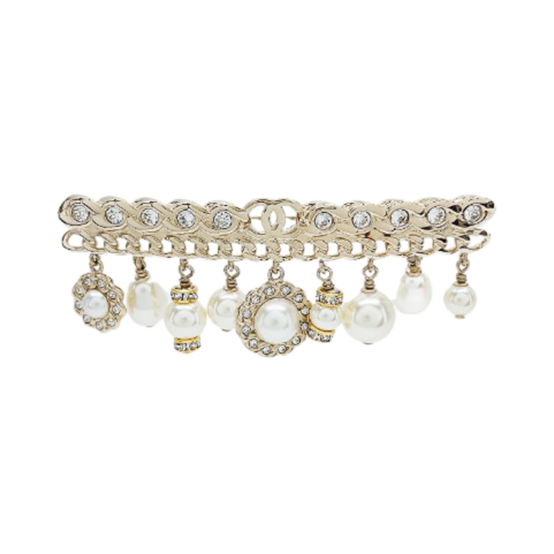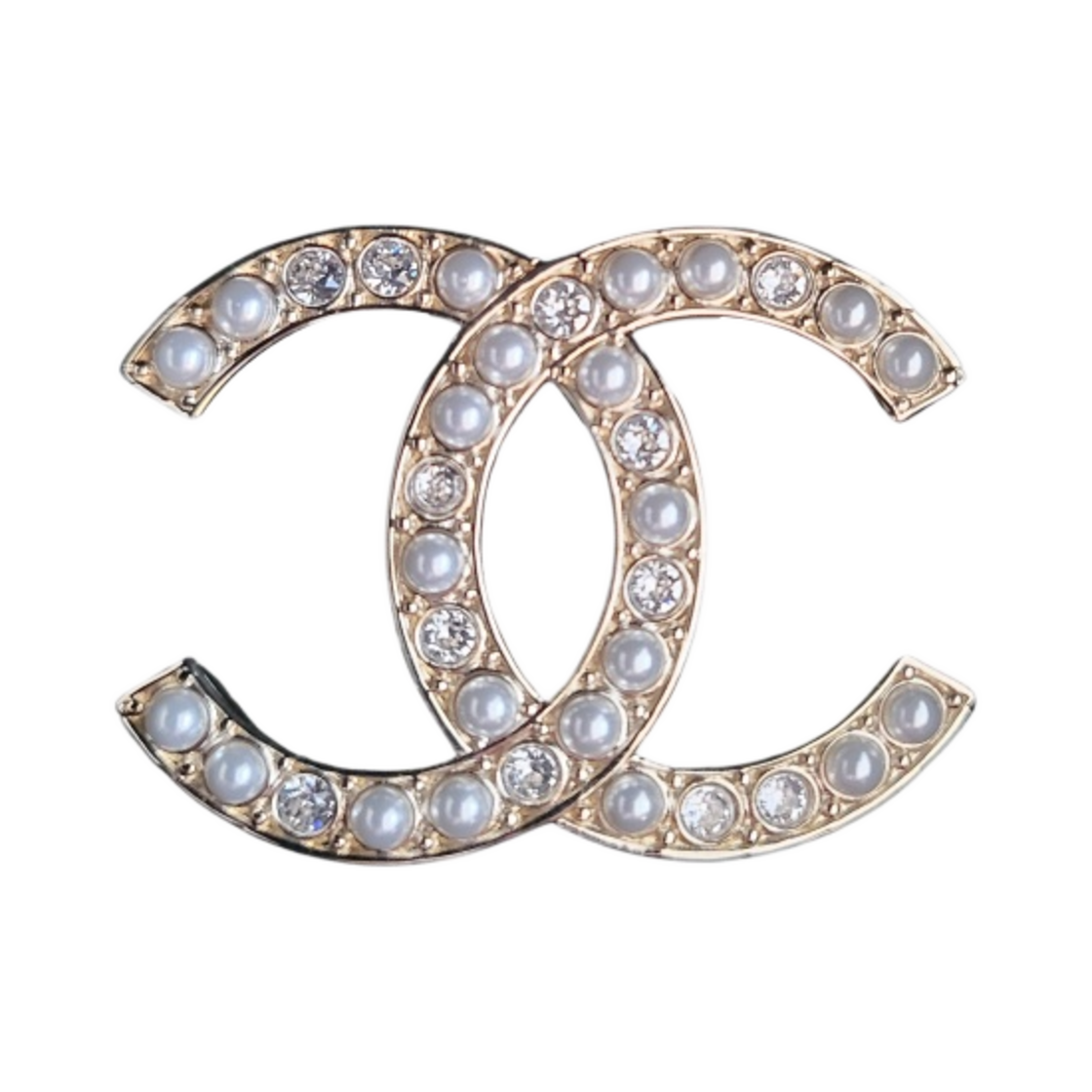 샤넬 브로치 메탈 라인스톤 & 골드 펄리 화이트 크리스탈