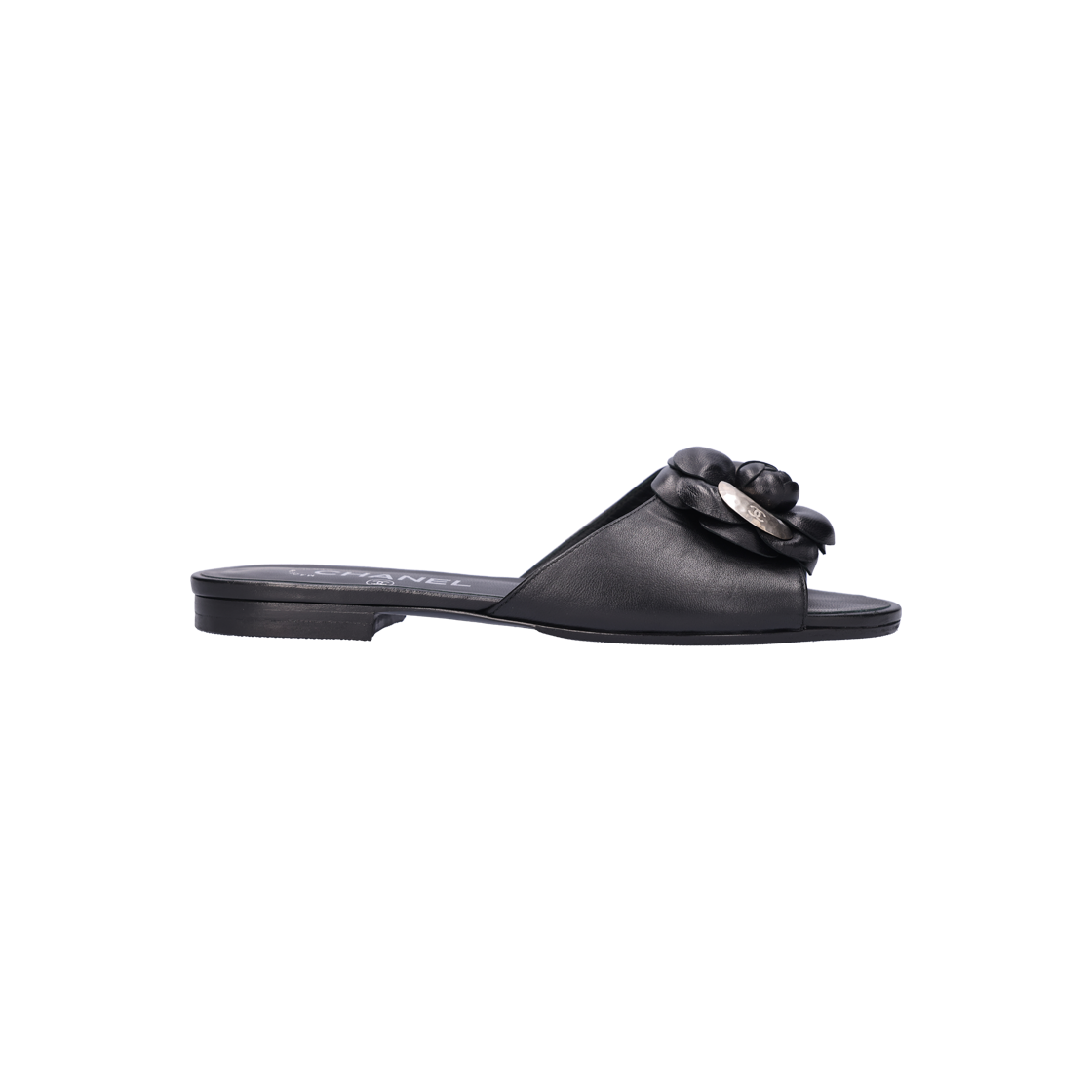 샤넬 G33698 블랙 램스킨 까멜리아 슬라이드 38 사이즈