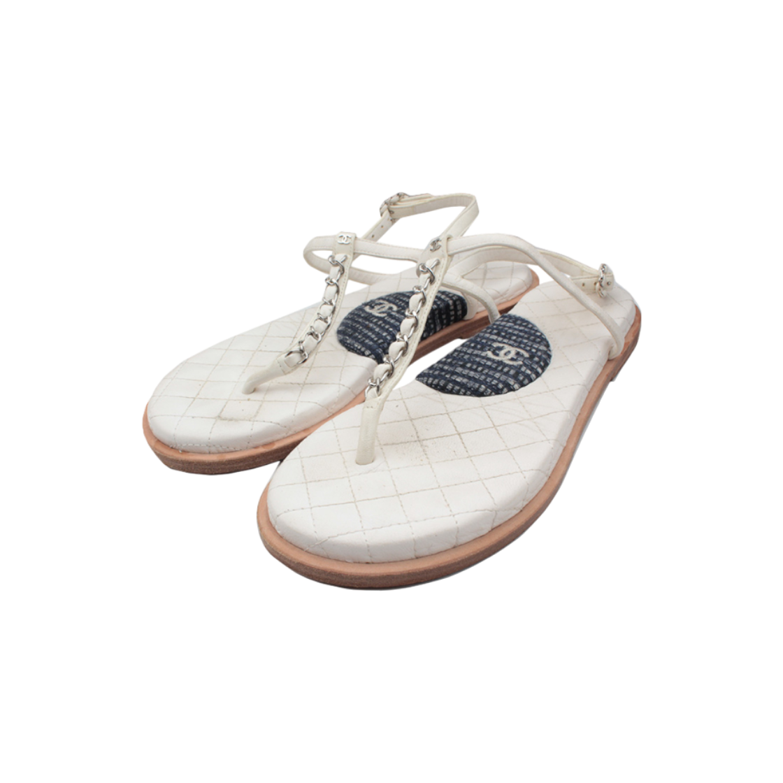 샤넬 화이트 퀼티드 T 스트랩 샌들 37C 사이즈