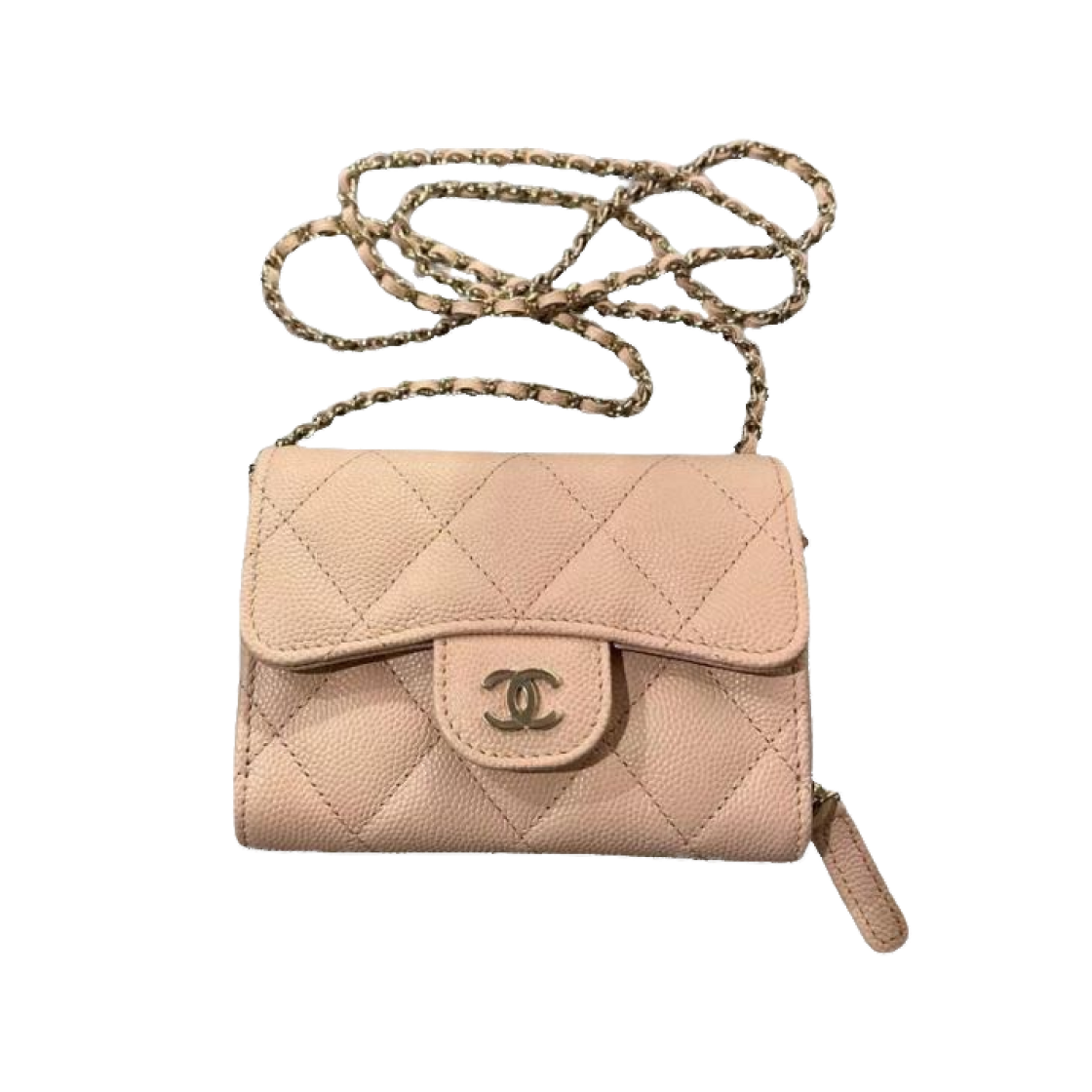 샤넬 클래식 지퍼 플랩 체인 카드 홀더 그레인드 카프스킨 & 골드 메탈 라이트 베이지