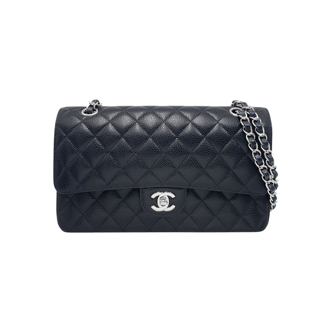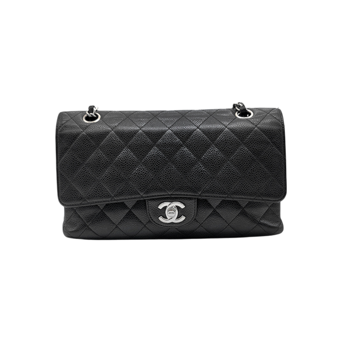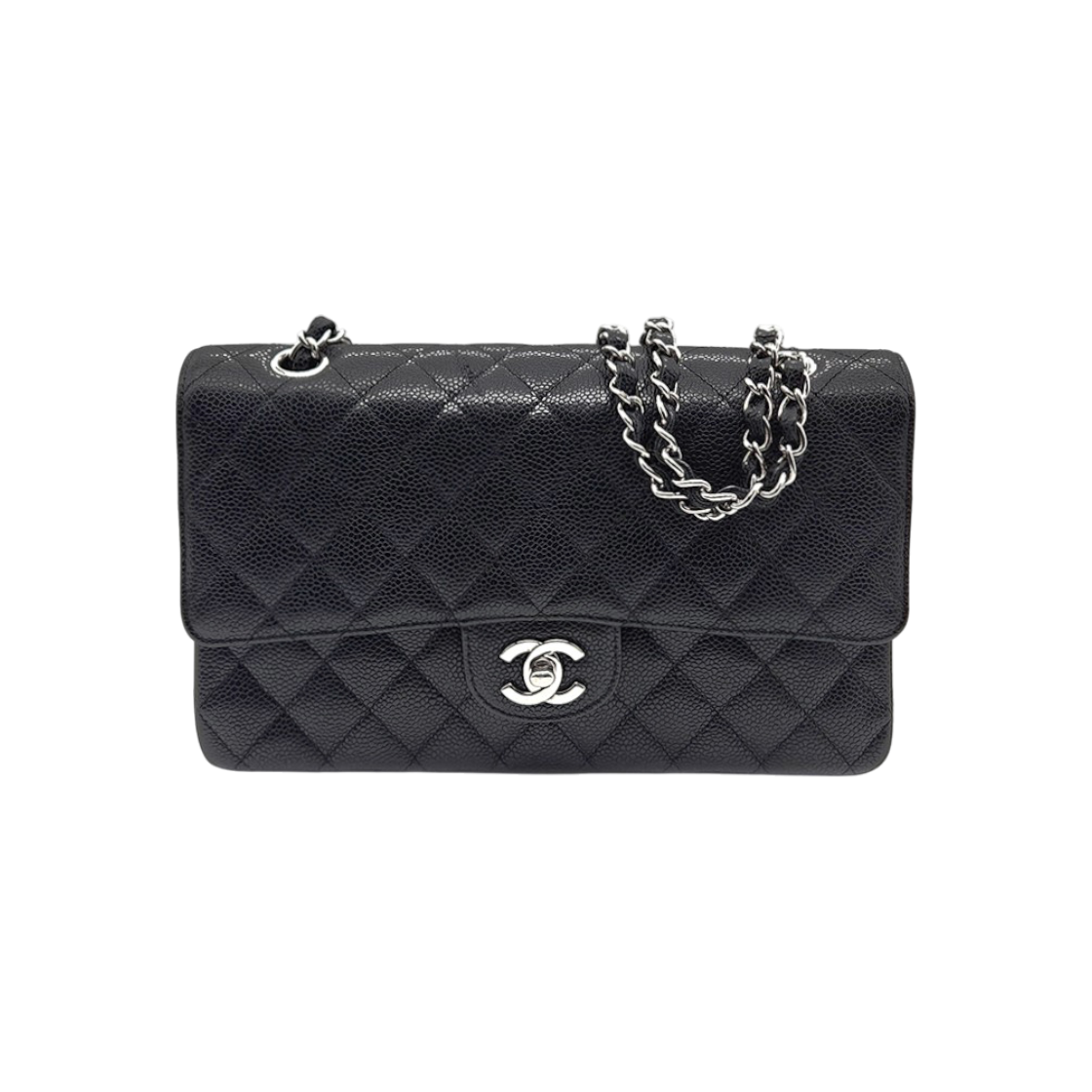 샤넬 클래식 미디움 플랩백 그레인드 카프스킨 & 실버 메탈 블랙