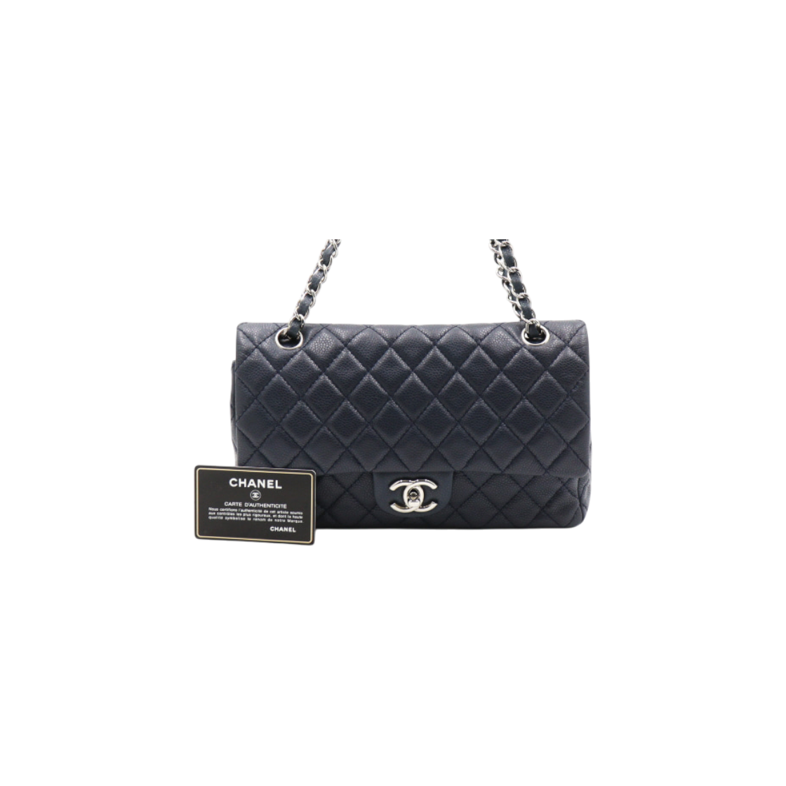 샤넬 A01112 시즌 한정 투톤 네이비 소프트 캐비어 클래식 미듐 은장체인 숄더백 aa48317