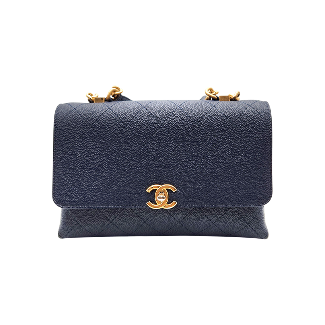 샤넬 핸들 장식의 미디움 플랩백 그레인드 카프스킨 & 골드 메탈 블랙