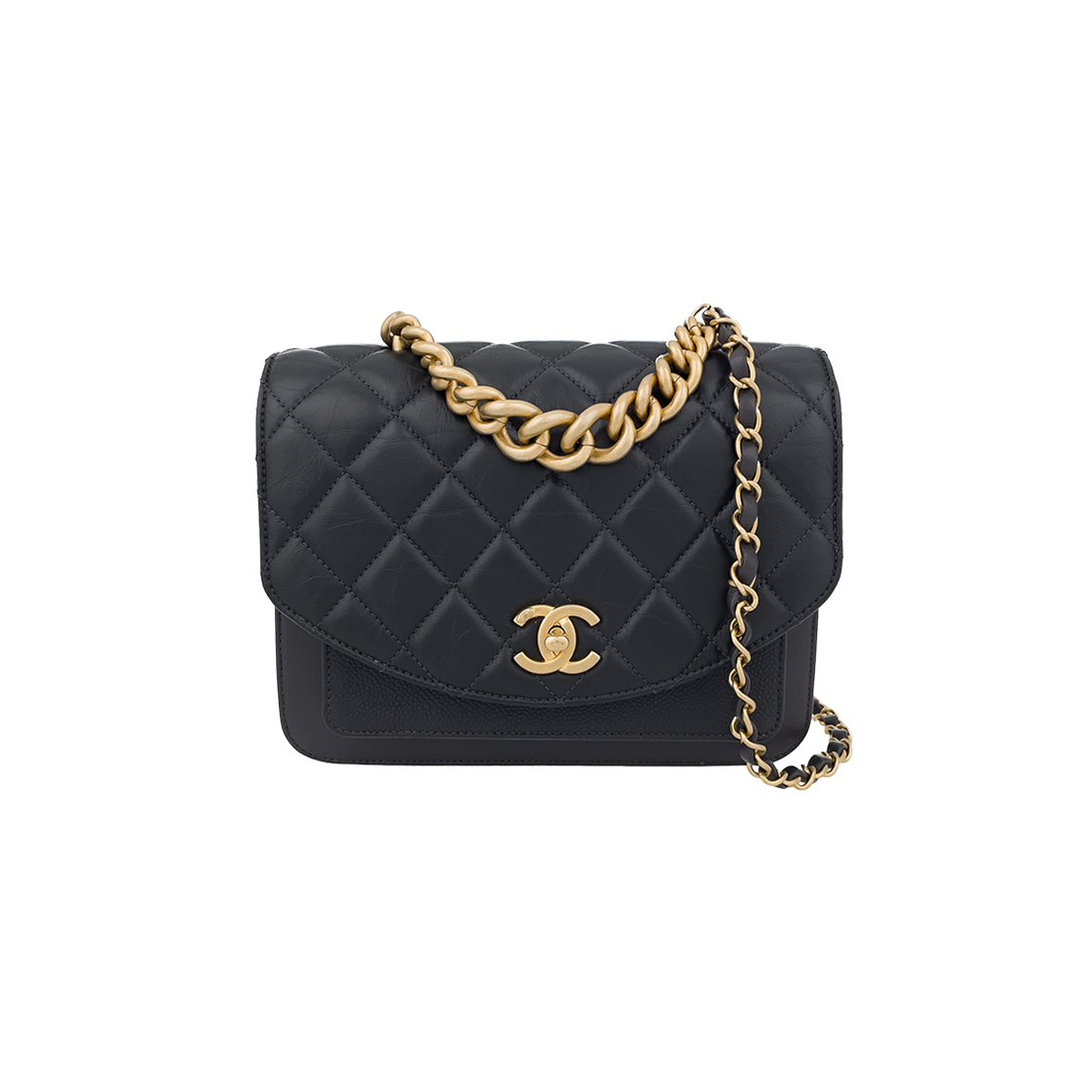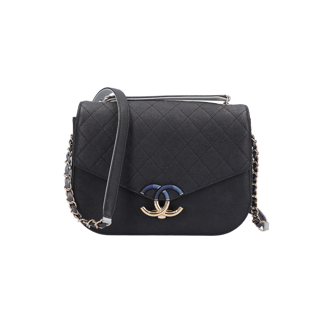 샤넬 핸들 장식의 미디움 플랩백 그레인드 카프스킨 & 골드 메탈 블랙