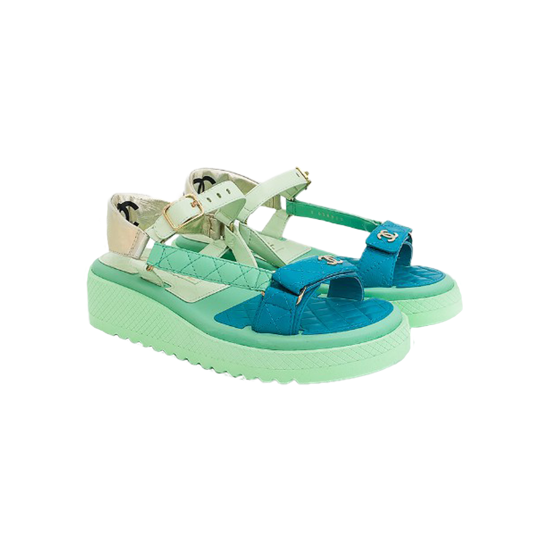 샤넬 22P 백레터링 샌들 37 그린/블루 샴페인골드