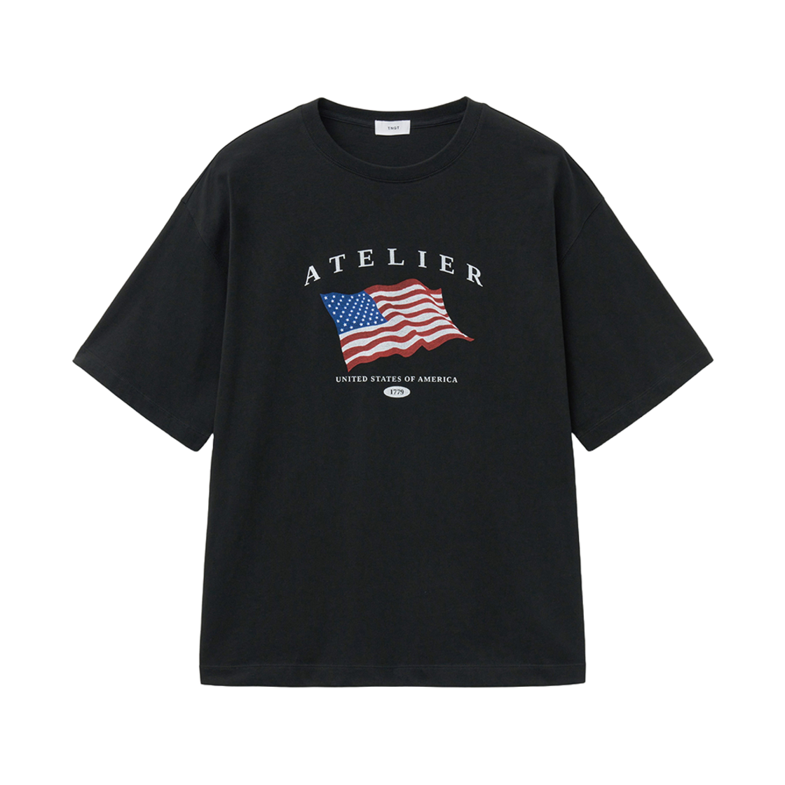 티엔지티 블랙 오버핏 성조기그래픽 티셔츠
