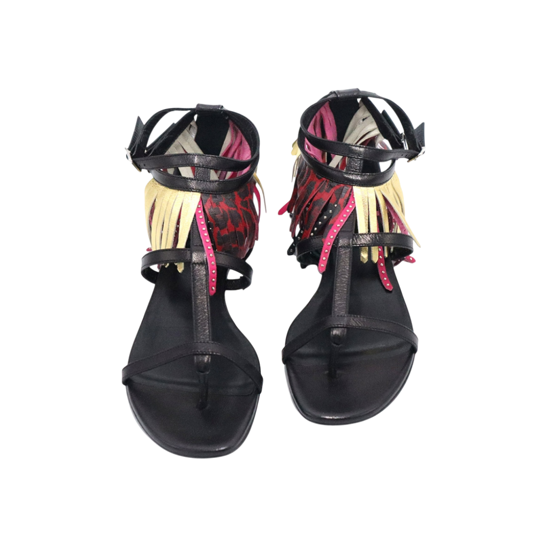 생로랑 블랙 레더 더블 스트랩 레오파드 테슬 플랫 여성 샌들 37