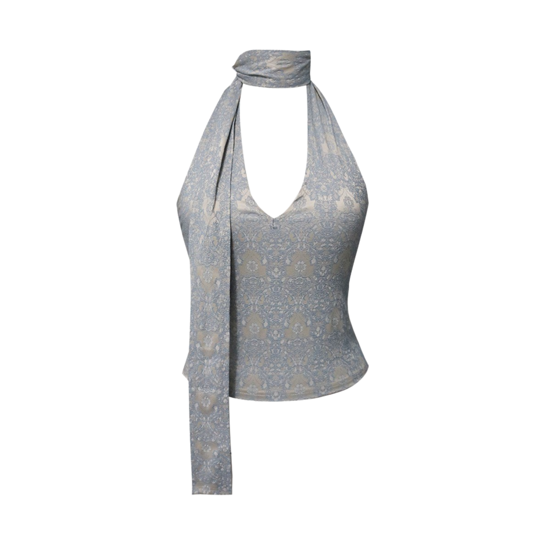 시오 자카드 브이넥 홀터 슬리브리스 탑 스카이