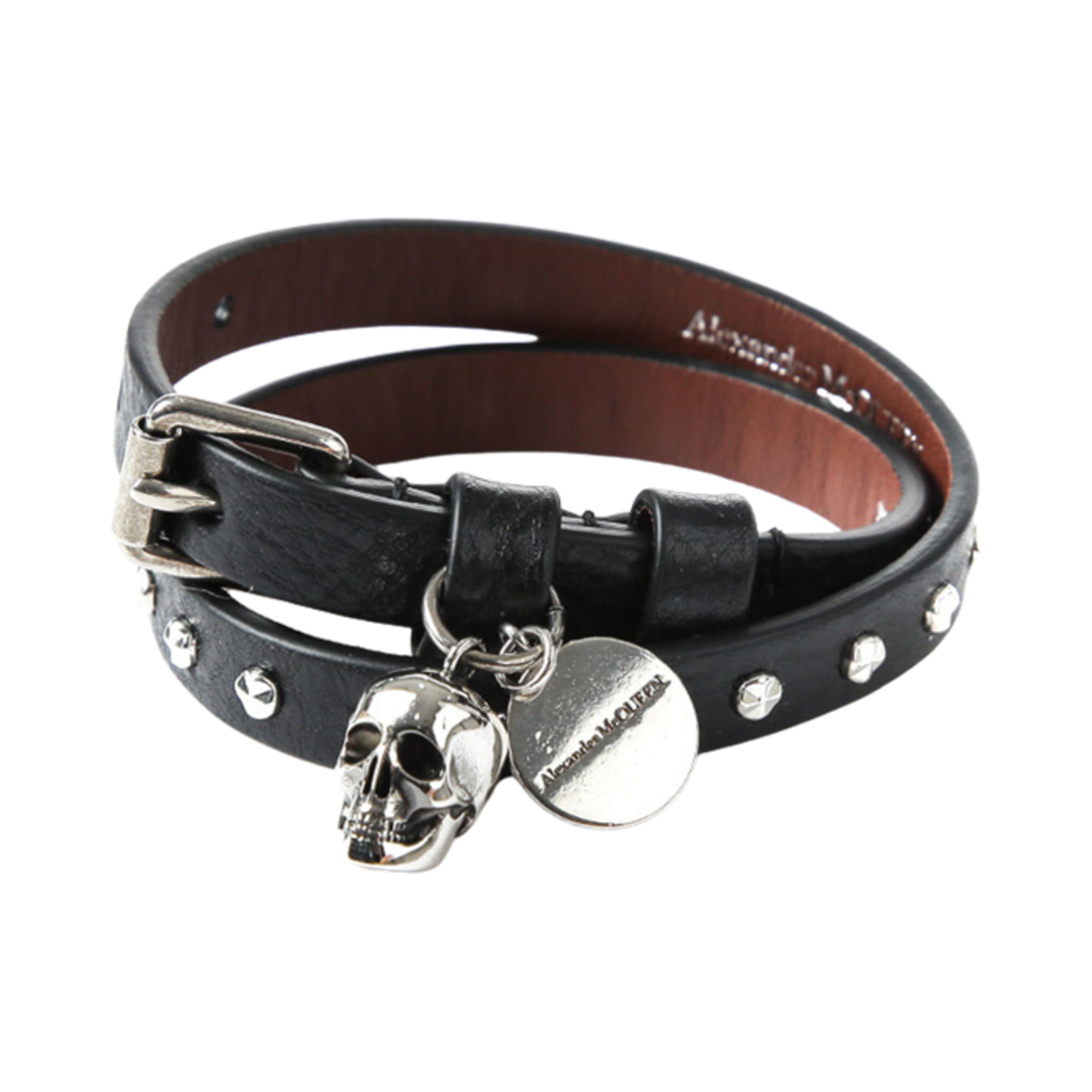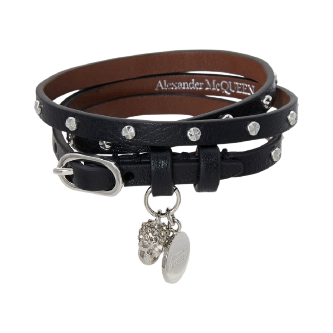 알렉산더 맥퀸 실버 스컬 스터드 더블 랩 브레이슬릿 블랙