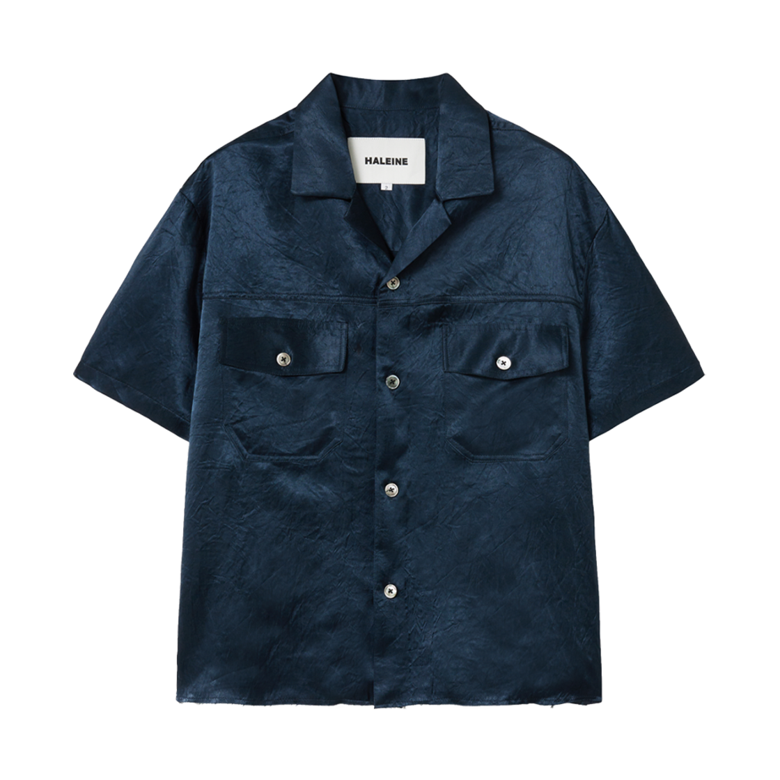 알렌느 오픈 칼라 크링클드 새틴 셔츠 네이비