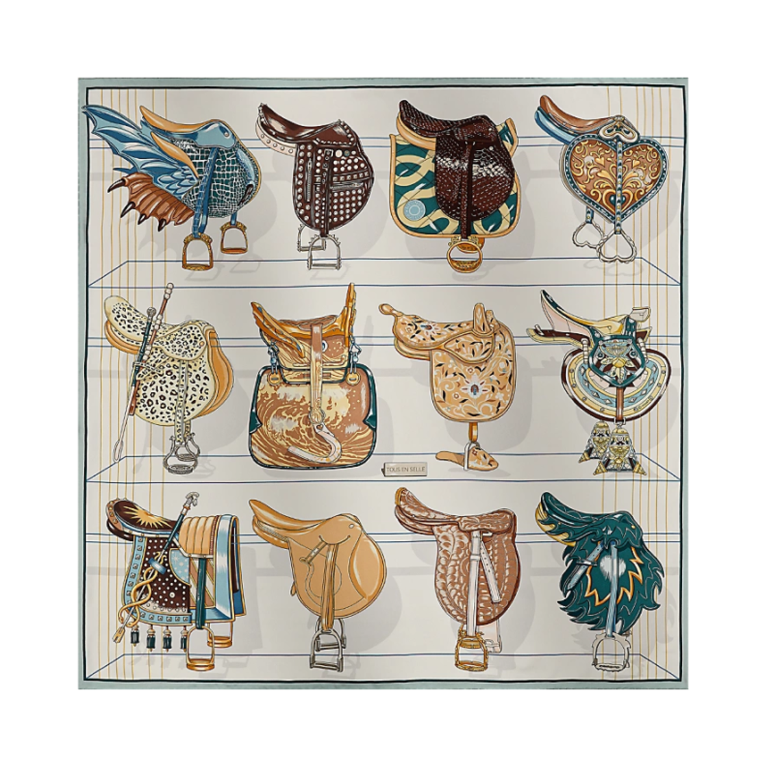 (W) 에르메스 뚜 앙 셀 스카프 90 그리 블뢰테 블랑 베쥬 도레
