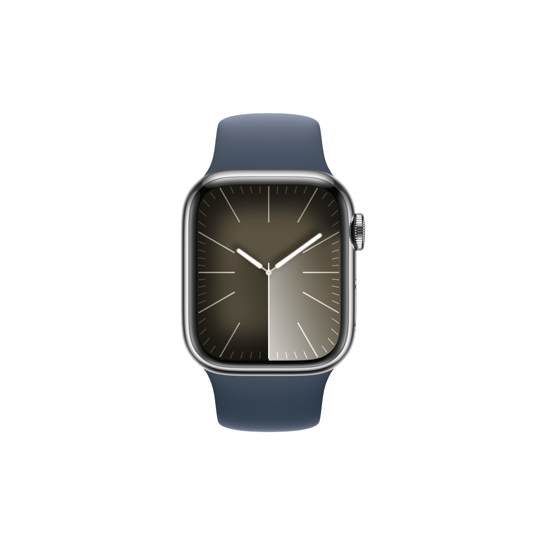 애플 워치 9 45mm 셀룰러 실버 스테인리스 스틸 케이스 스포츠 밴드 S/M 스톰 블루 (국내 정식 발매 제품)