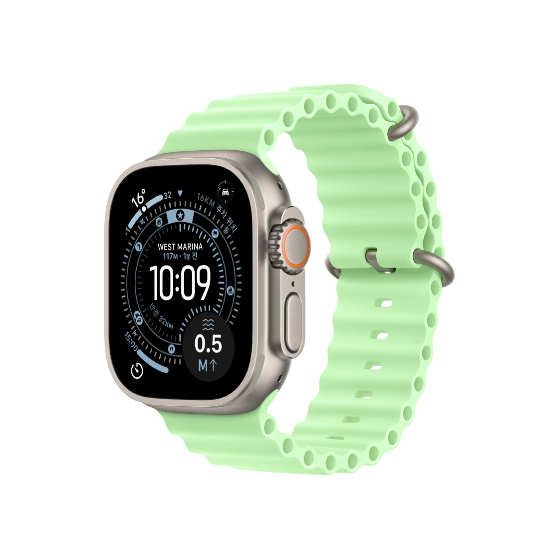 애플 워치 울트라 3 49mm 내츄럴 티타늄 케이스 오션 밴드 네온 그린 (국내 정식 발매 제품)