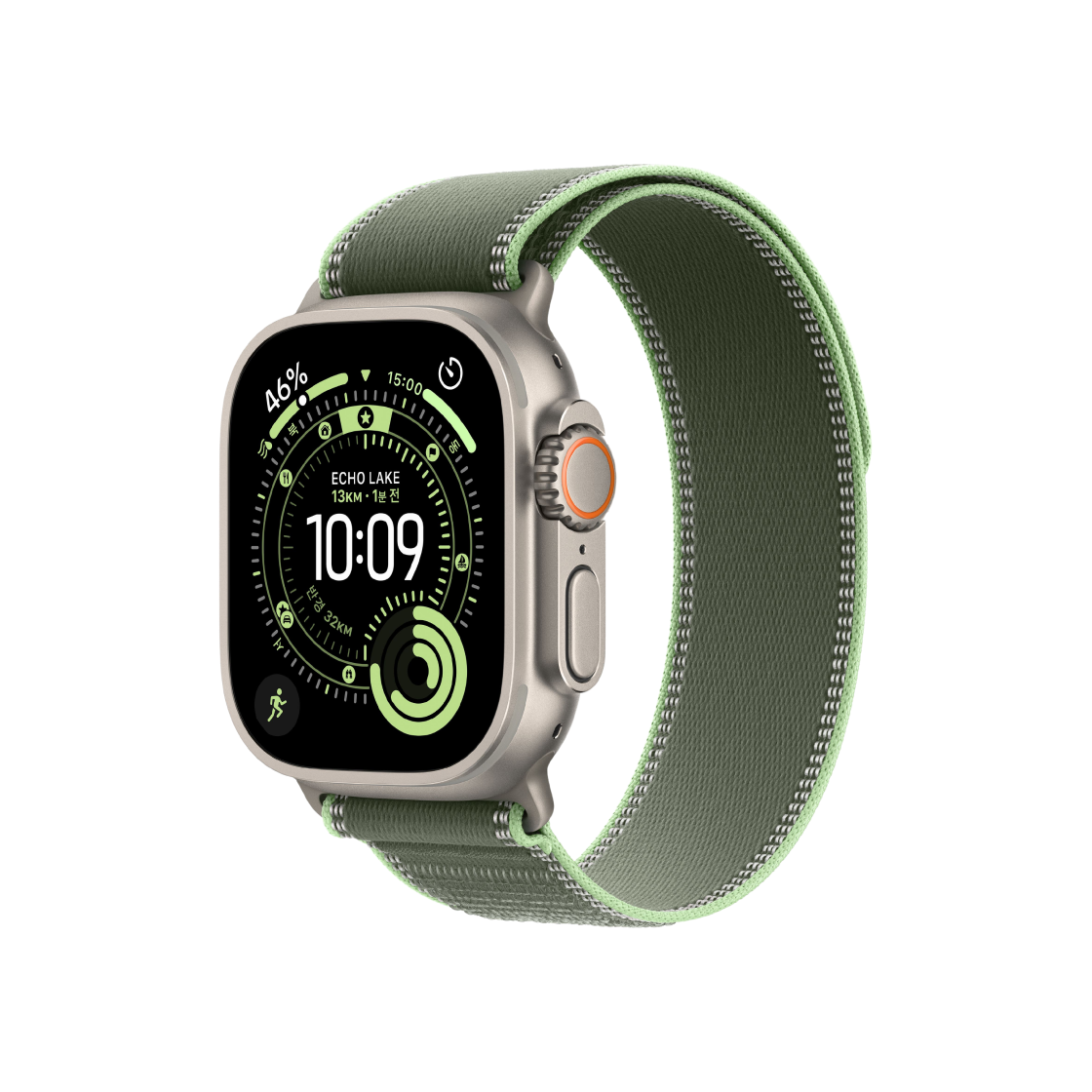 애플 워치 울트라 3 49mm 내츄럴 티타늄 케이스 M/L 트레일 루프 그린 네온 (국내 정식 발매 제품)