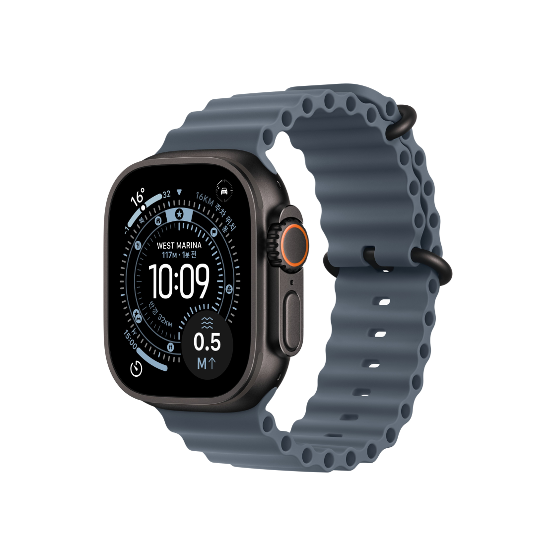 애플 워치 울트라 3 49mm 블랙 티타늄 케이스 오션 밴드 앵커 블루 (국내 정식 발매 제품)