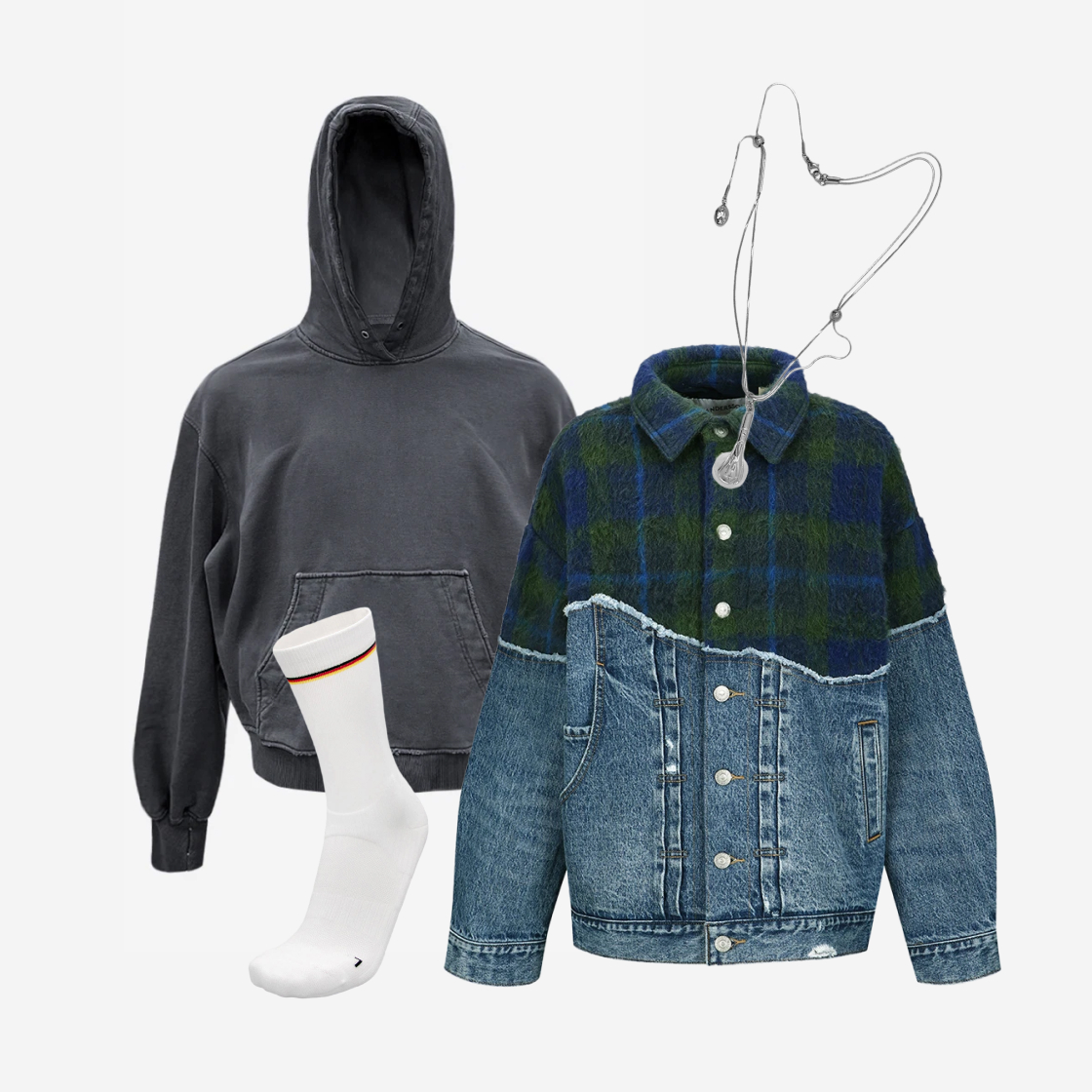 비엘알 빈티지 가먼트 다잉 후디 블랙, 삭스업 컴프레션 러닝 크루삭스 화이트, ADSB 앤더슨벨 x 리바이스 우먼 스플라이스드 트러커 인디고 그린 - 24FW, 카시코 x 센티멍 레이어드 슬라이드 이어폰 네클리스 SET
