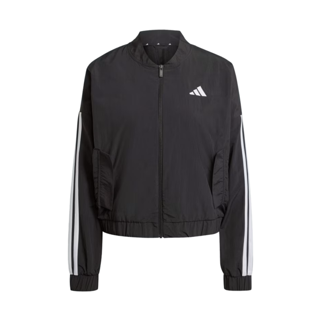 (W) 아디다스 에센셜 삼선 라이프스타일러 우븐 봄버 자켓 블랙 화이트 - US 사이즈