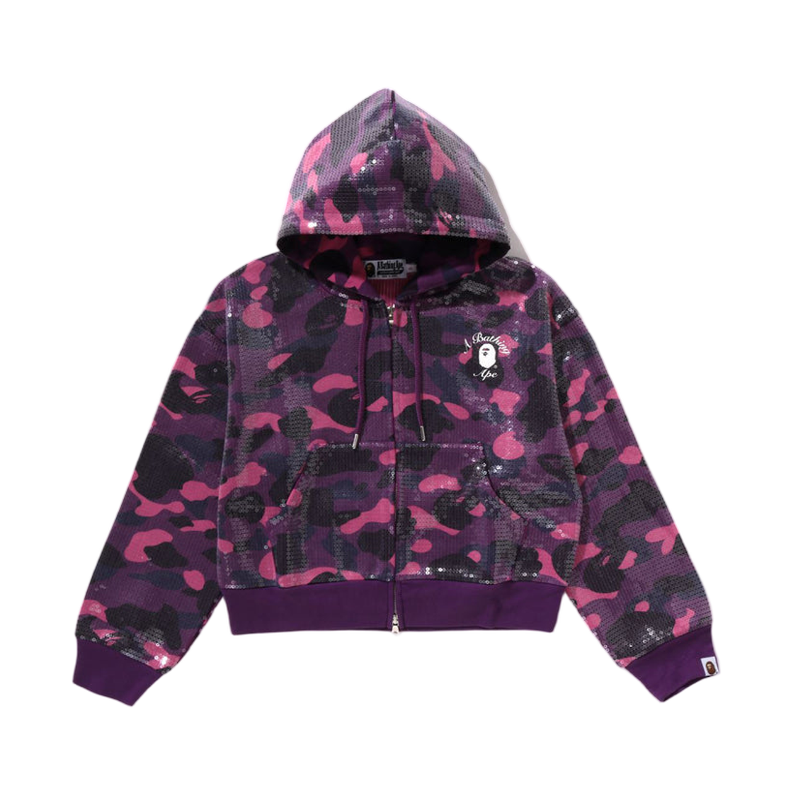 (W) 베이프 컬러 카모 에이프 헤드 시퀸 크롭 풀 집 후드 퍼플